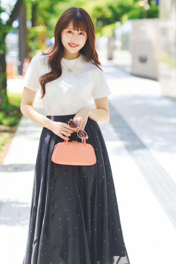 Tシャツ¥12,100/アルページュストーリー スカート¥25,300/ジャスグリッティー ネックレス¥28,600/シャルロットウーニング(フラッパーズ) サングラス¥22,000/フルラ(デリーゴジャパン) バッグ¥49,500/ケイト・スペードニューヨーク(ケイト・スペード カスタマーサービス)
