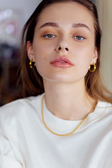 【PLUS ACCESSORIES】 延長線で輝くゴールドのきらめき。リップ次第では、派手にも陥るピアスとネックレスの“Wゴールド”。ヌーディーな唇ならトーンがそろってむしろ上品。