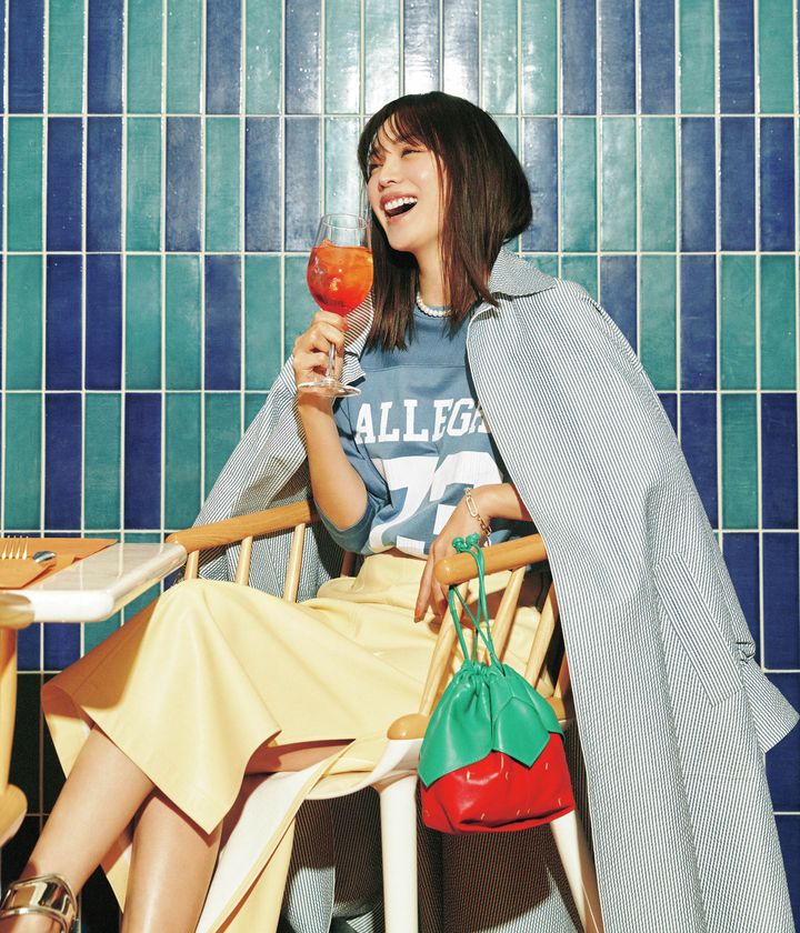 Tシャツ¥23,100(ウィム ガゼット/ウィム ガゼット 玉川髙島屋S・C店)コート¥190,300(ポステレガント)スカート¥25,300(マカフィー/トゥモローランド)バッグ¥75,900(ヘリュー/ヘリュージャパン オフィシャルオンラインストア)ブレスレット¥55,000(ブランイリス/ブランイリス トーキョー)ネックレス¥101,200(ビジュードエム/ビジュードエム六本木ヒルズ)その他スタイリスト私物