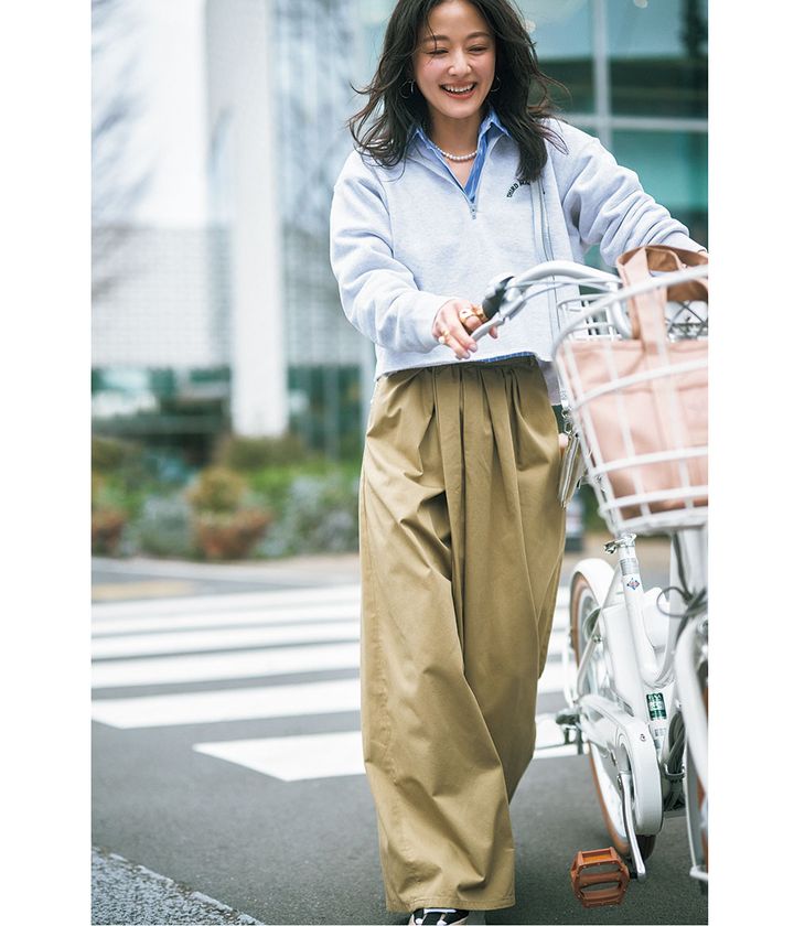 送迎は自転車移動なので、パンツスタイルが定番ですが、動きやすさを求めてつい同じコーデに頼りがちに。そんな時のマイルールは〝どこかにときめく要素を仕込む〟ことです。いつもきゅんとできて、どこかに新しさを取り入れていれば、送迎シーンでも気負わず、自分らしいスタイルで楽しめると思います。(モデル・中越典子さん)