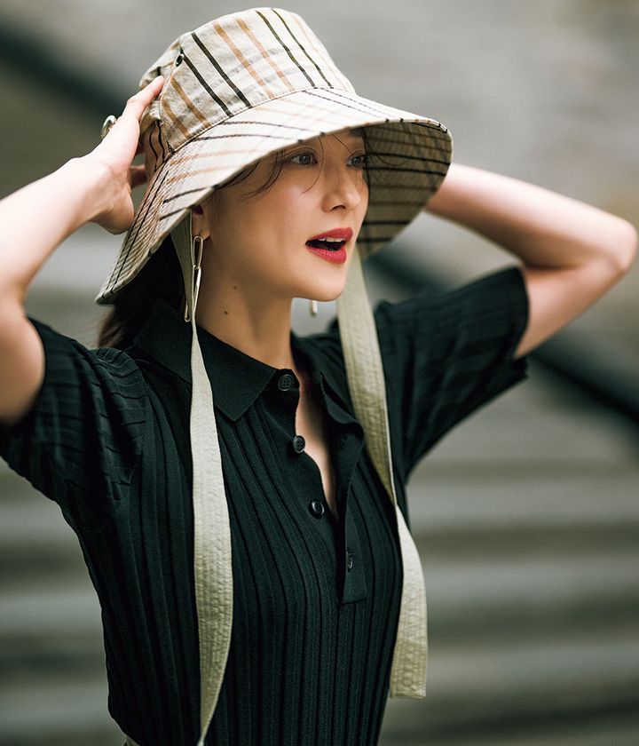 シャツベルトパンツ¥11,550(スタイルミキサー)ポロニット¥27,500(ハイク/ボウルズ)バッグ¥37,400(ヴァジック/ヴァジックジャパン)ペイズリー柄トートバッグ¥26,400(マニプリ)帽子¥17,600(メゾンドリリス)パンプス¥79,200(ペリーコ/アマン)ピアス¥33,000ブレスレット¥35,200(ともにブランイリス/ブランイリス トーキョー)リング[右手]¥50,600(プラウ)リング[左手]¥4,950(loni)