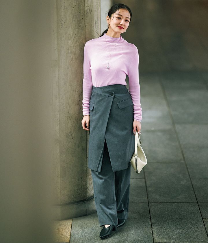 ラップスカート¥39,600パンツ¥41,800(ともにチノ/モールド)ニット¥13,200(カデュネ)バッグ¥165,000(J&M デヴィッドソン/J&M デヴィッドソン カスタマーセンター)パンプス¥19,250(ジネス/チアキカタギリ/ジオン商事)メガネ¥40,700(ブラン/ライト)ピアス¥31,900(ブランイリス/ブランイリス トーキョー)ネックレス¥7,920(アンタイトル)リング[右手]¥3,900(soie/ロードス)リング[左手]¥27,500(バルブス/ズットホリック)