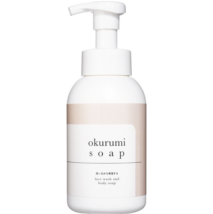 「お仕事用のメイクも二度洗いで」。赤ちゃんや敏感肌、頭皮からデリケートゾーンまで全身OK。okurumi soap 320ml ¥4,200(羽田甚商店)
