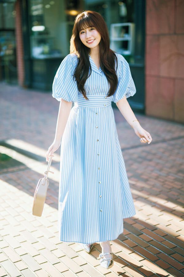 暑すぎて重ね着するのが辛い気温の日はワンピが助かる! 清涼感と細見え効果のあるブルーストライプのワンピは二の腕をカバーするパフスリーブと太めベルトでメリハリあるシルエットが魅力。