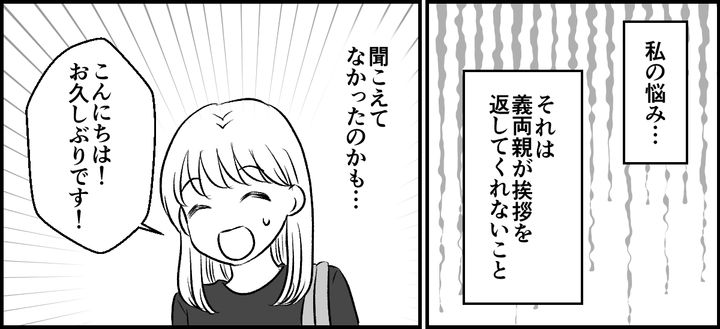私のちょっとした悩み……それは義両親に挨拶をスルーされること。もともと気にはなっていましたが、こうして子どもが生まれて言葉を喋るようになり、より気になる場面が増えてきました。