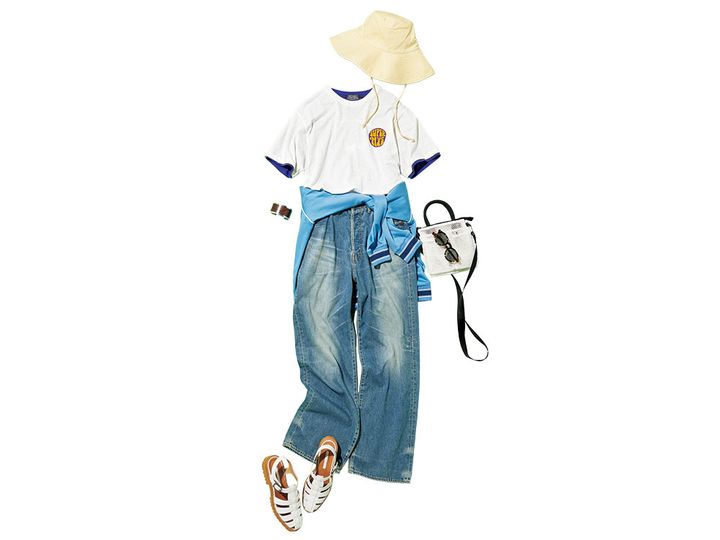 白Tシャツ¥14,300紫Tシャツ¥13,200ブルゾン¥44,000(すべてヒステリックグラマー)バッグ¥16,500(ノマディス/ノーベルバ)サンダル¥38,500(ヨシトデオランジュ/ニューロンドン)ハット¥16,500(ラック オブ カラー/ジャック・オブ・オール・トレーズ プレスルーム)サングラス¥47,300(アイヴァン/アイヴァン 東京ギャラリー)バングル¥43,120(ブランチ/ZUTTOHOLIC)