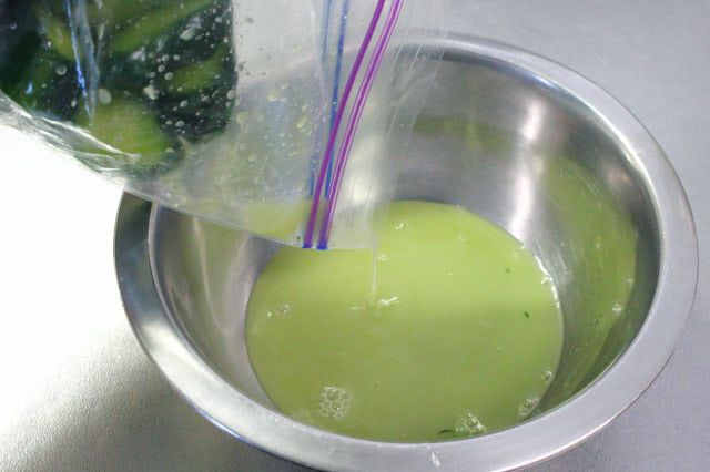 塩と砂糖の浸透圧で、きゅうりからたっぷりの水分が出ました。水分だけを袋から出すと、わさびの味が流れ出てしまったのではないかと、不安になるほどのわさび色!