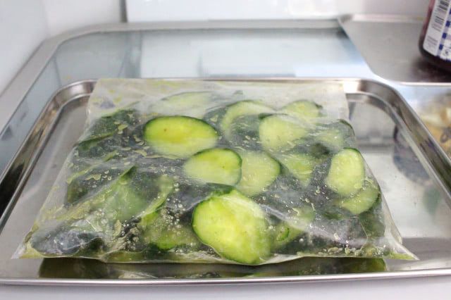 あとは、冷蔵庫で6時間漬けるだけです。1時間ほどできゅうりから水分が出たので、漬けている間に2度ほど調味液を揉み込みました。