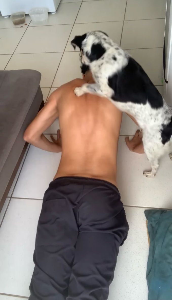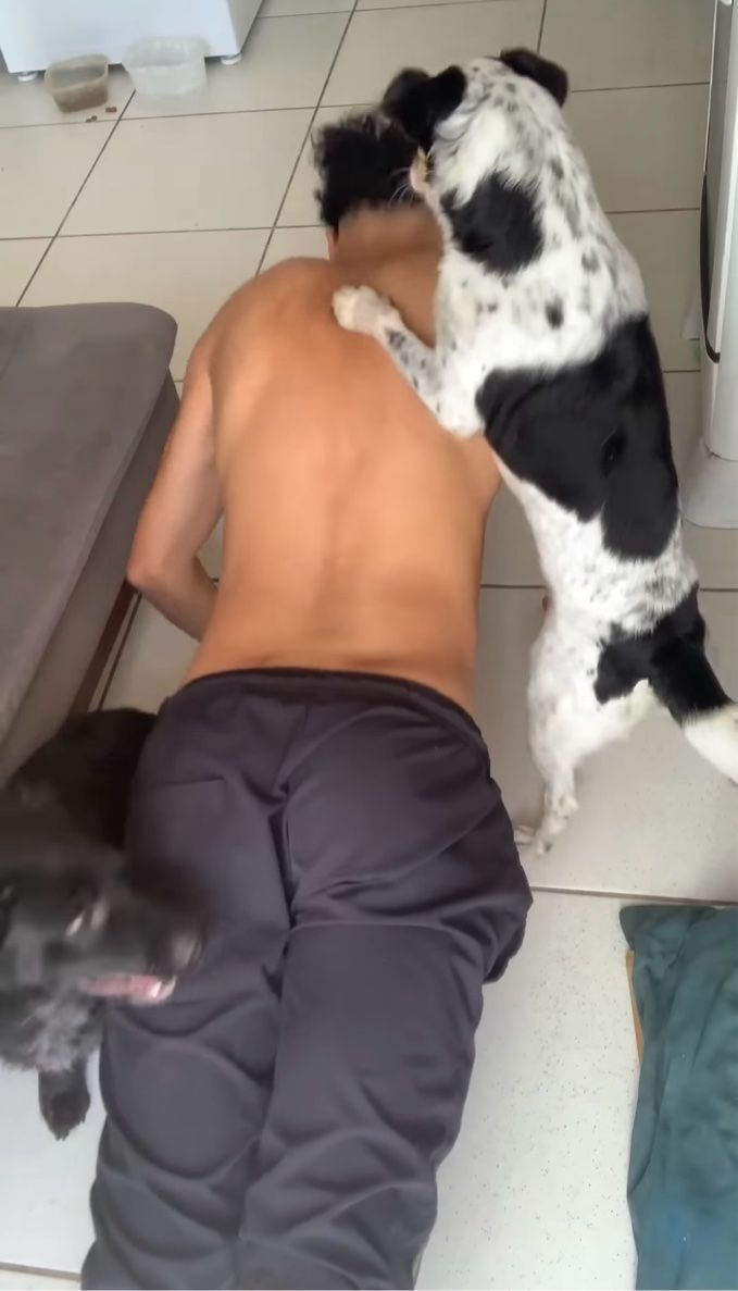 黙々と腕立て伏せに取り組む飼い主さんのことを、すぐそばで見守っている愛犬たち。 しかも、右の子にいたっては、飼い主さんの背中に乗っていました!