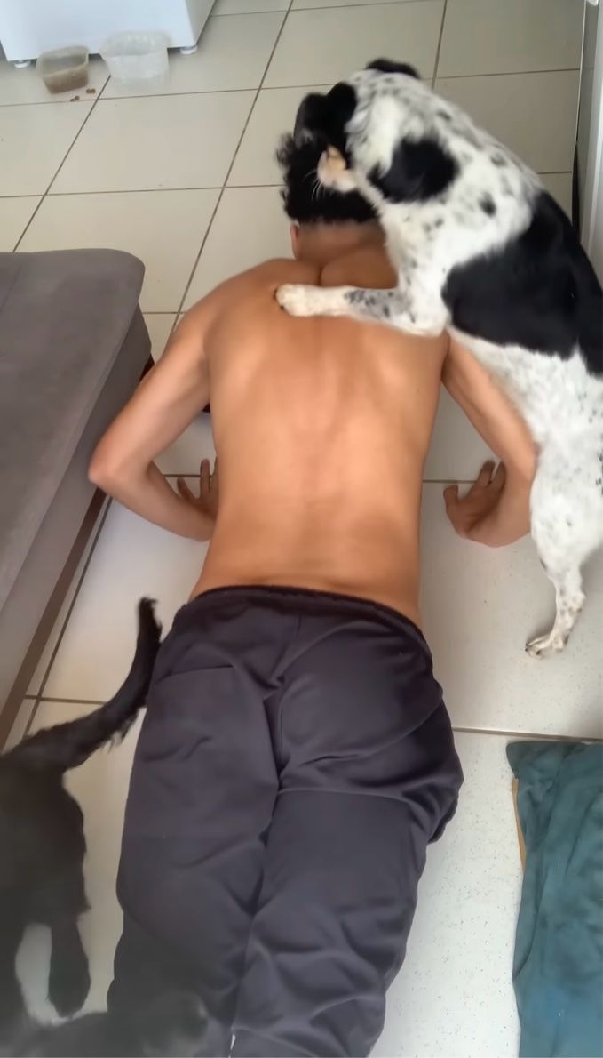 この子たちは、ただ見守っているだけではありませんでした。 映像の右側にいる子は負荷をかけるように、飼い主さんの背中をグイッと押しているのです!