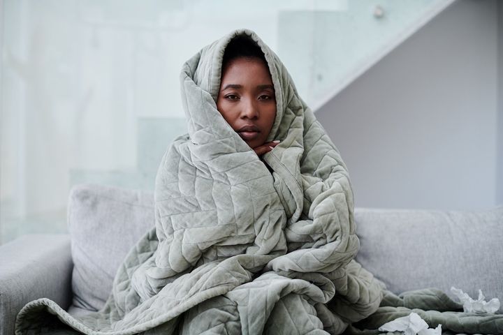 Woman with fever symptoms sitting on sofa and holding thermometer