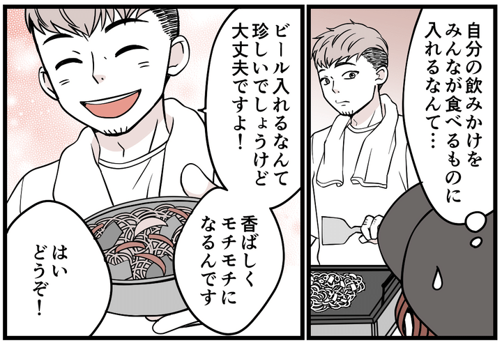 自分の飲みかけのビールを、これからみんなが食べる焼きそばにかけるなんて……。家庭で料理を作っていてもそんなことしたことがないし、もし自分の旦那がそんな料理を作ったら絶対に食べません。
