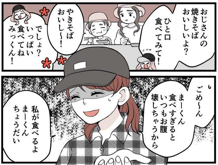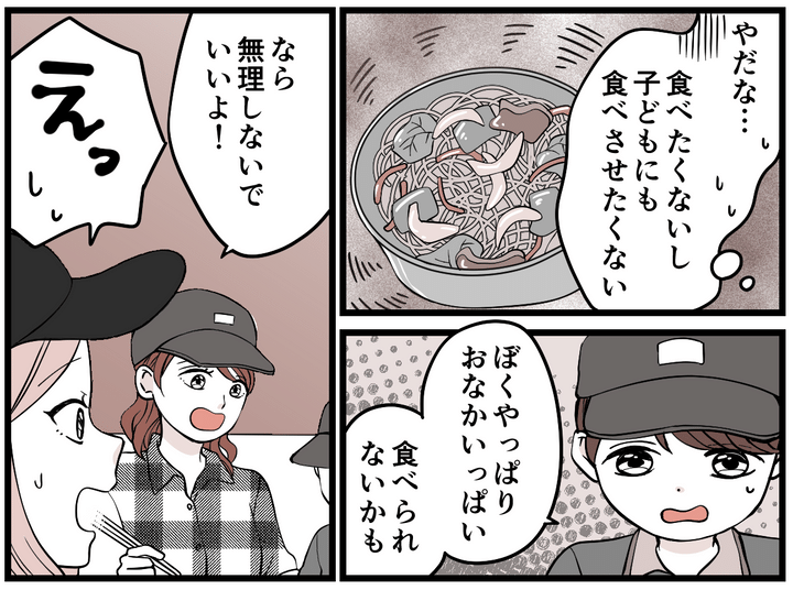 (食べたくないな。でも食べないと雰囲気が悪くなるよね……)(まーくんにも食べさせたくない……どうしよう……)私がぐるぐると考えていると……「ぼく、やっぱりおなかいっぱいだから食べられないかも……」まーくんの言葉に、「なら無理しないでいいよ!」と強めに返事をしました。