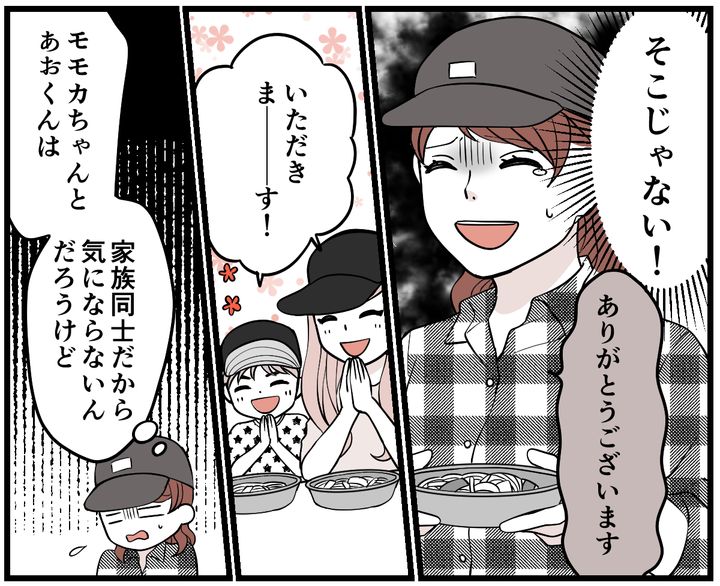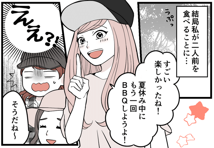 でもモモカちゃんは「ワイルドだよね〜」と言うだけで……。BBQだとこれが当たり前なのでしょうか……? まーくんが食べないと言うので、食べないに越したことはないと無理にすすめませんでしたが……私はその場の雰囲気を考えて食べざるを得ませんでした。