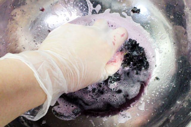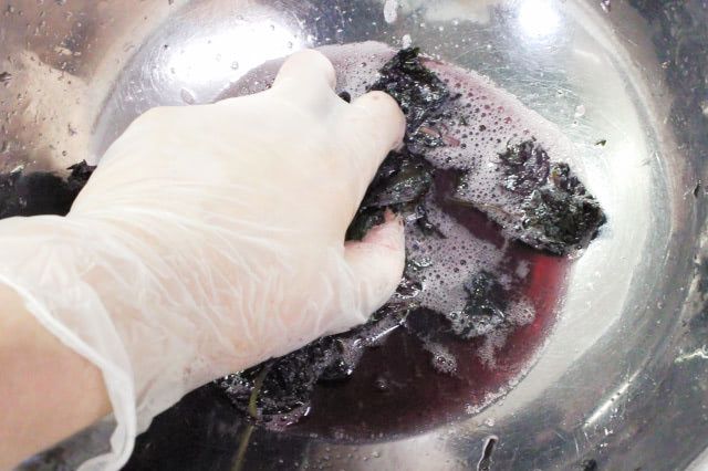 赤じその色が手に付かないように手袋をするのがおすすめとのこと。塩をまぶした赤じそを1分ほど揉むと、ぶどうのような色の汁と泡がじゅわじゅわと出てきました。この汁は赤じそのアクなので取り除きます。