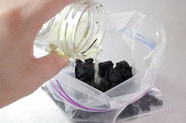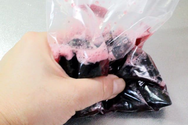 袋の上から揉むと、酢が赤紫色の液体に。なんだか実験をしているみたい。