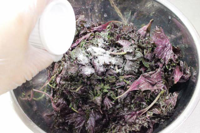4. たっぷりの水で赤じそを2回ほど洗って水気を切り、ボウルに入れて塩(赤じその重さの10%の量)の半量を加えて塩揉みします。