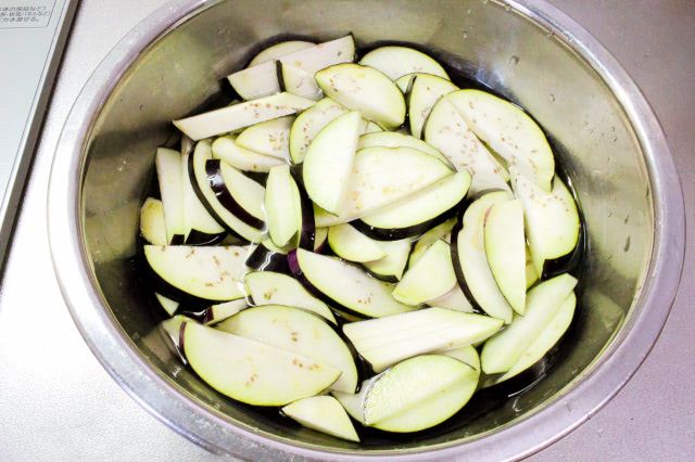 1. なすを縦半分に切って3mm幅の斜め薄切りにし、水に浸してアク抜きします。