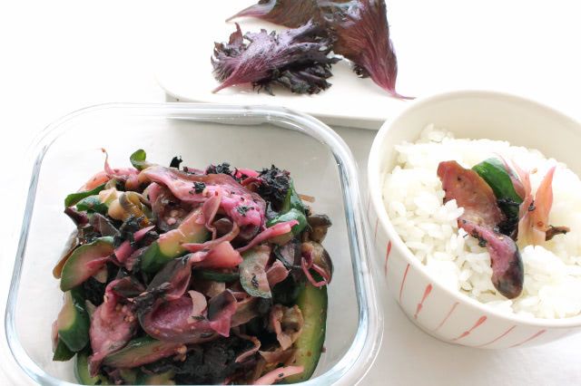 ご飯(分量外)に乗せて食べてみると、赤じその風味が強めでなんだかミントを思わす爽快感。野菜の水分を抜くのに塩、もみしそにも塩を使っているので、しょっぱめの味わいに。