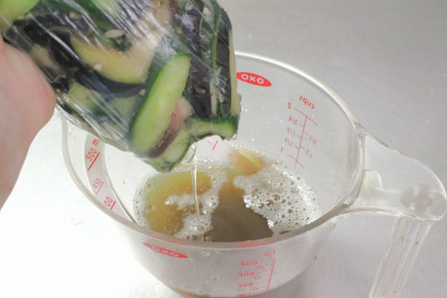 1分ほど塩揉みしてアクをしっかりと絞りました。ちなみに1回目と2回目で出たアクを計量すると約180mlに!