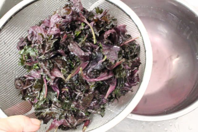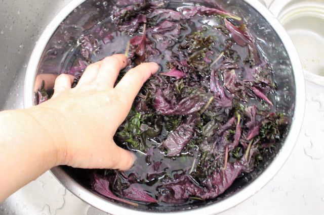 軽く洗っただけでも色素が抜けて、水がほんのりと紫色に!赤じその色素の強さにびっくり。