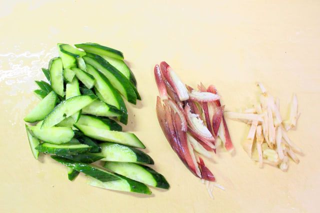 きゅうり、みょうが、しょうがとも細く切りました。
