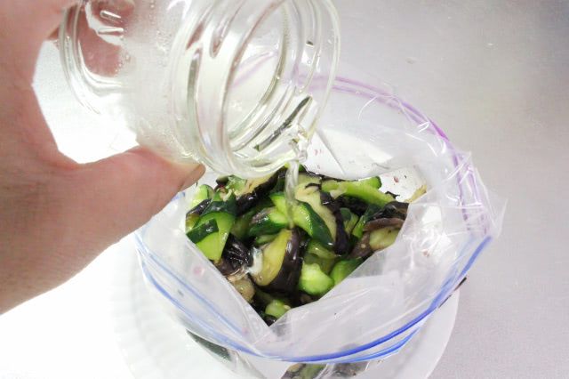 7. ジッパー付き保存袋に入れて酢を加え、袋の上からしっかりと揉み、空気を抜いて口を閉じて冷蔵庫で10分ほど漬けます。