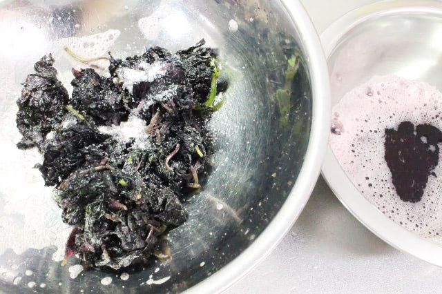 1回目でアクがたくさん出たのに、もう一度塩揉みするとアクと泡がまた出てきました。どんどんアクが出るので赤じその色が抜けてしまわないかと心配に。そして塩揉みしているというよりも、洗濯している気分です。
