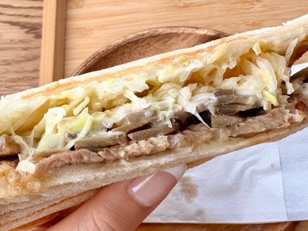 ボリューミーなホットサンドは、生姜焼きのしっかりした味付けにゴボウのシャキシャキとした歯ごたえ、マヨネーズであえたキャベツのマイルドな酸味が一体となって、とっても美味しい。