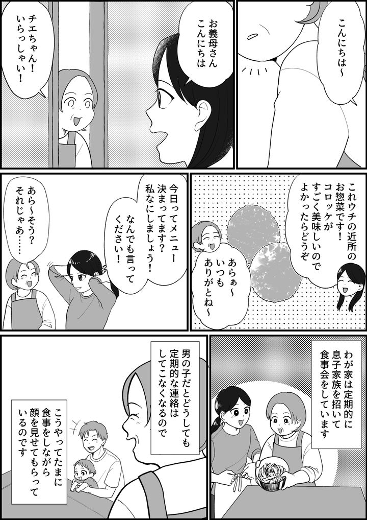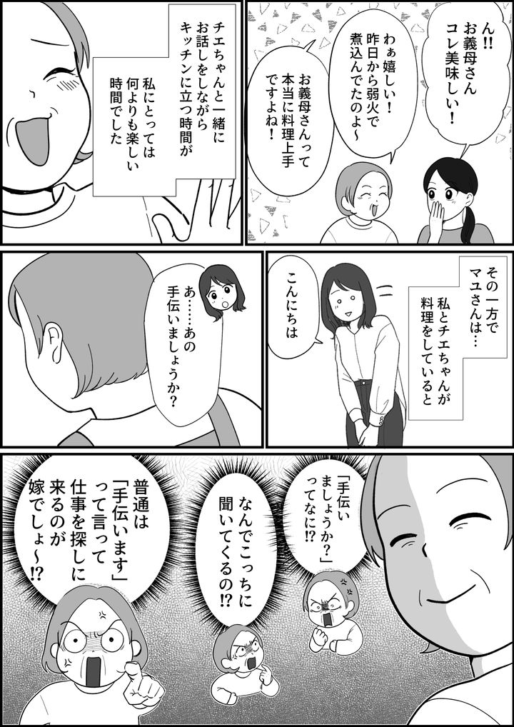 わが家は定期的に息子家族を招いて、食事会をしています。チエちゃんと一緒にお話しをしながらキッチンに立つ時間は、私にとっては何よりも楽しい時間でした。しかし、マユさんは仕事はできるようですが、人としての愛想がまったくありません。マユさんに「あの、手伝いましょうか……?」と言われ、その言葉に私はカチンときてしまうのです。