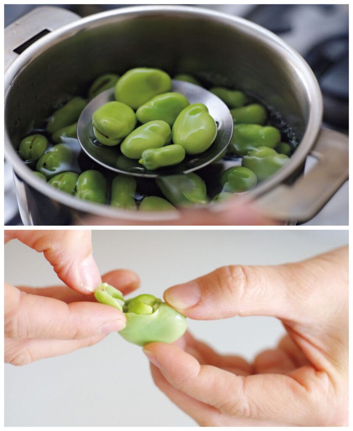 そら豆を湯にくぐらせるのは10秒ほど。ここでは火を入れすぎないようにします。皮をむくときは黒い筋の部分からはがすようにすると、スムーズ。