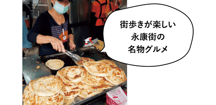 美食店をはじめ、食べ歩きグルメ、お土産や雑貨買いも楽しい永康街。この通りを歩いているとつい食べたくなるネギ餅。しっとりとしたパイのような食感で、素朴なのに味わい深くヤミツキに。
