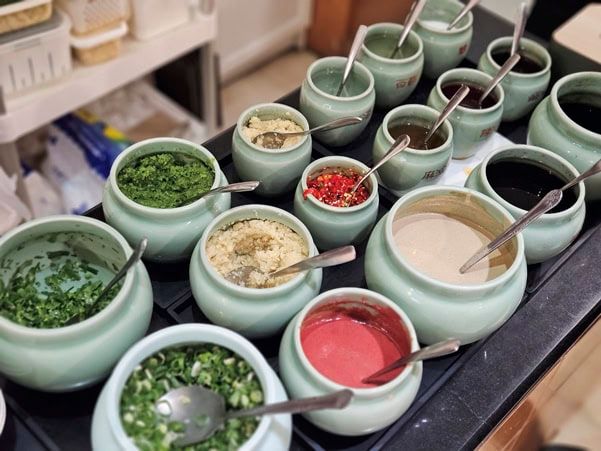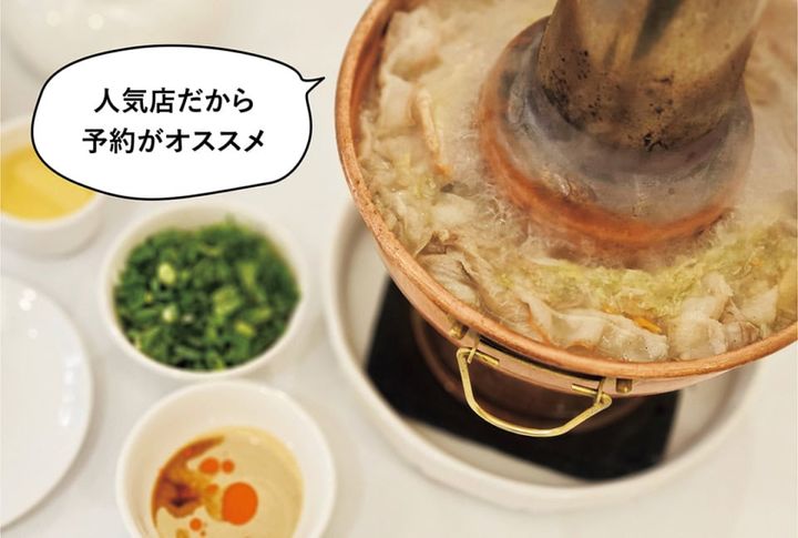 煮えたぎる鍋の中には発酵白菜と豚肉、牡蠣や干し海老、椎茸、凍豆腐などの具材が。自分好みに調合したタレや薬味と共にいただく鍋は、まろやかな酸味がクセに。WEB予約できるので、ランチ時間に合わせて事前予約を。