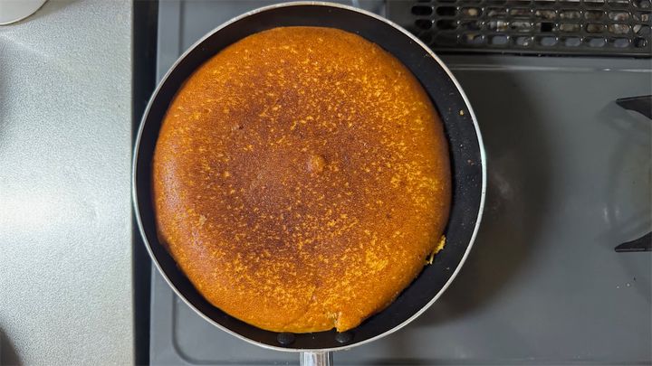 3. 生地の周りにぷくぷく気泡がではじめたら裏返し、再びフタをしてさらに弱火で6分焼く。最後の1分は少し火を強め、表面をこんがりさせる。