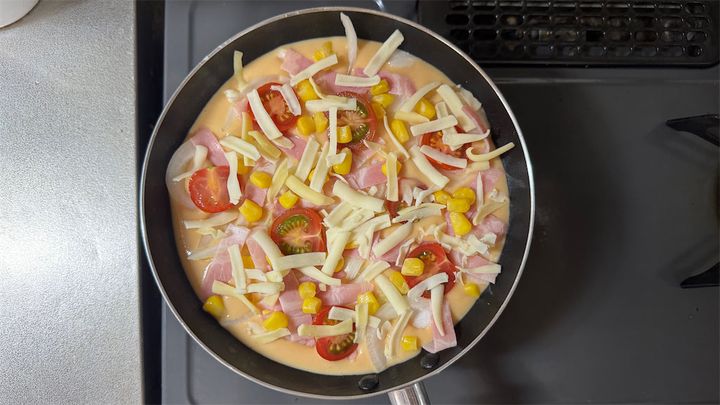 フライパンに油(分量外)を薄く塗り、火はつけずに生地を流し入れる。具材をのせ、ピザ用チーズを散らしたら、フタをして火をつけ、弱火で6分焼く。