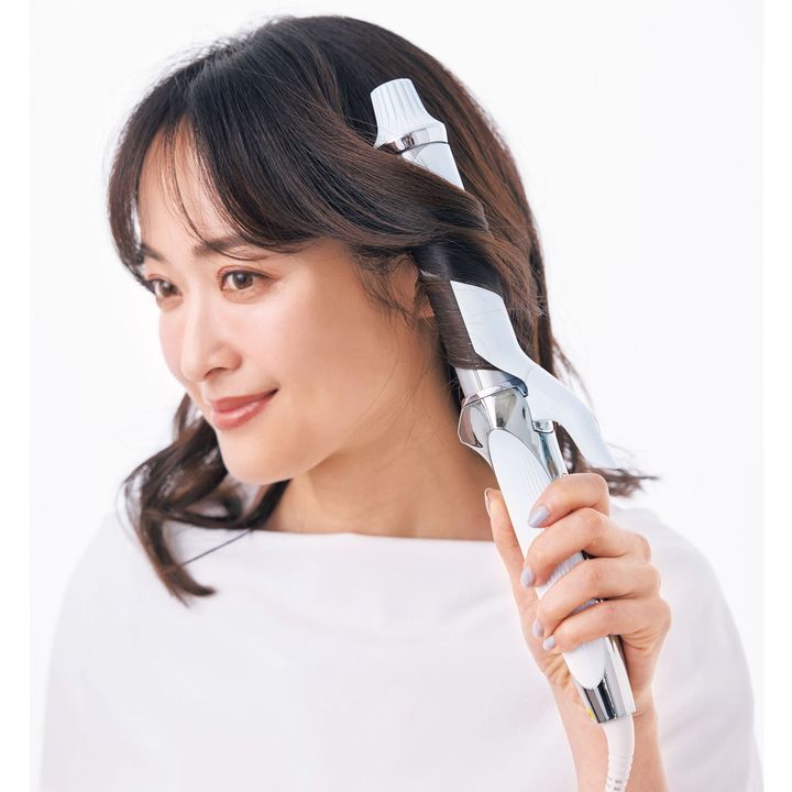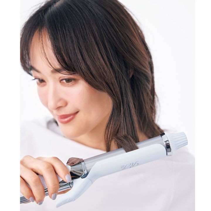 毛先を強めに巻くのも、全体を自然なミックス巻きにすることもできる、太めの32㎜のアイロンが使いやすい。リファカールアイロン プロ32 ホワイト¥25,000(MTG)
