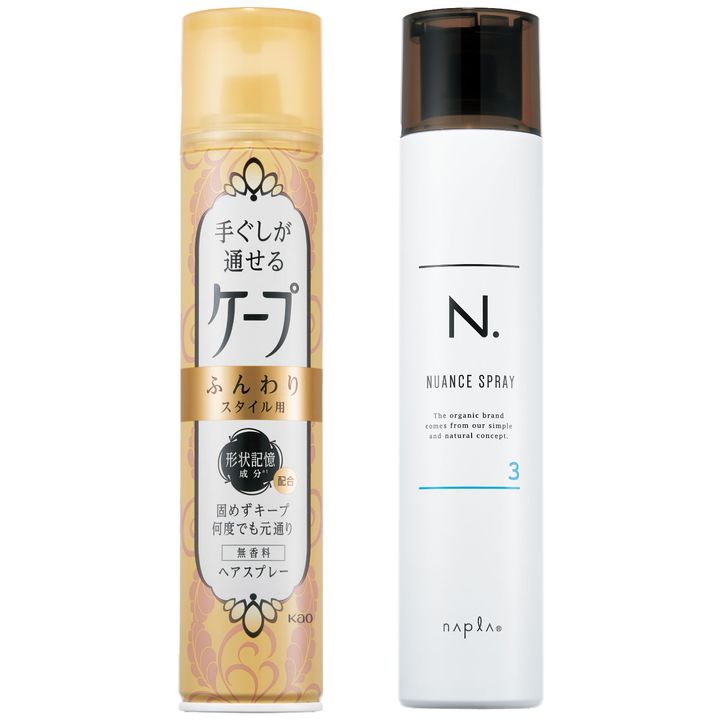 左から:【こちらを使用】手ぐしが通せるケープ ふんわりスタイル用 無香料140g¥786〈編集部調べ〉(花王)N. ニュアンスヘアスプレー3 180g¥1,760〈美容室専売品〉(ナプラ)