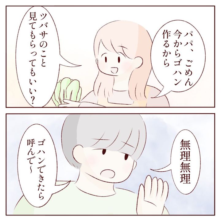 「パパ、ごめん。今からゴハン作るから。ツバサのこと見てもらってもいい?」と言うと、「無理無理。ゴハンできたら呼んで~」と不機嫌そうな顔をするカズキは、
