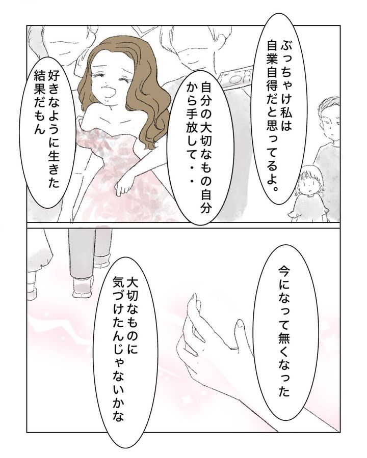 「ぶっちゃけ私は自業自得だと思ってるよ。自分の大切なもの自分から手放して・・好きなように生きた結果だもん」そう言った後で、「今になって、無くなった大切なものに気づけたんじゃないかな」