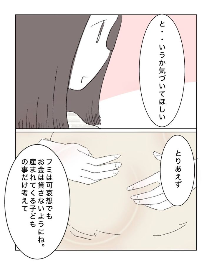 「と・・いうか気づいてほしい。とりあえず、フミは可哀想でもお金は貸さないようにね。産まれてくる子どもの事だけ考えて」と言いました。