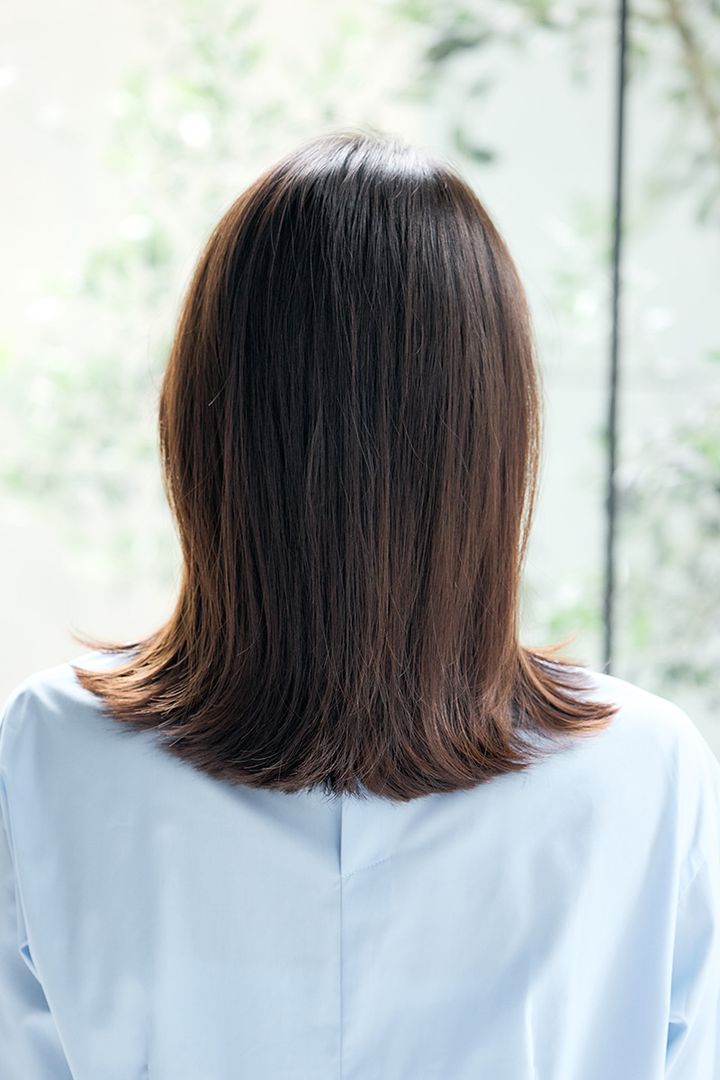 ・切りっぱなしベースのミディアムレングス。顔周りにレイヤーがあることで小顔効果が叶います。