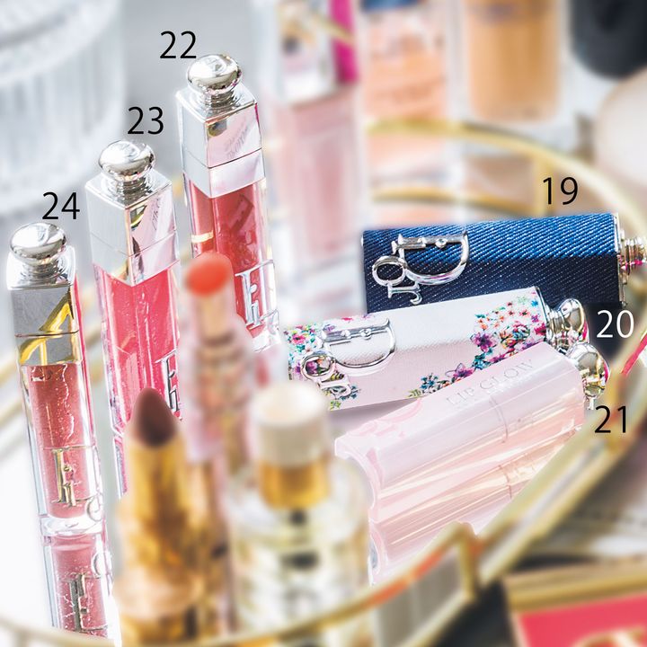 リップ命なのでプランパーはマスト。19、20 チュルンとした唇になるディオール アディクト リップスティック 100、526。21 リップ グロウ 007。22、23、24 マキシマイザー 005、026、029。