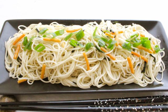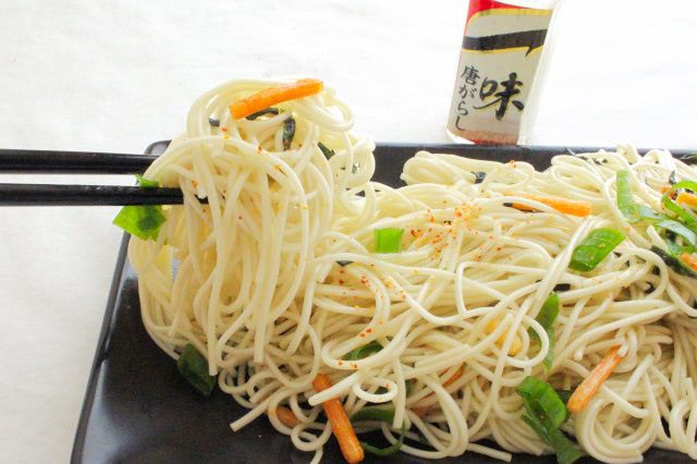 フライパンが温まったらそうめんとお茶漬けの素を入れ、1分ほど炒めました。これで完成♪お皿に盛り付けて青ねぎを散らし、お好みでしょうゆと唐辛子をかけたら完成です。