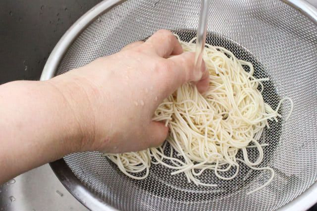 そうめんのぬめりが取れるように流水で洗って、しっかりと水気を切りました。炒めるので、氷水で締める必要はありません。
