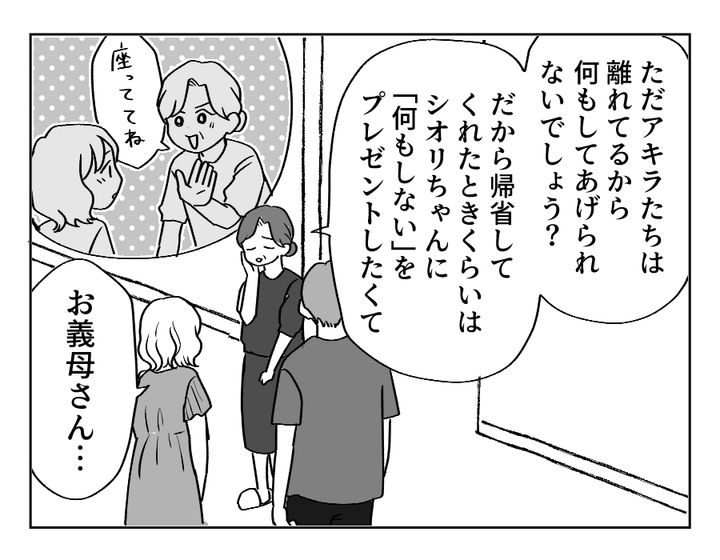 私(シオリ)は、夫のアキラと、5才の長女、3才の長男の4人家族。夫の姉ユウコさんは夫婦共働きで、男の子2人(6才、2才)を育てながら義実家の近所で暮らしています。義実家はわが家から遠方なので、私たちの帰省はお盆と年末年始の年に2回。帰省自体には不満はないのですが、夫が帰省の度に義姉に義両親への高額なプレゼント代を渡していることにモヤモヤしていました。そこで夫と話し合い、義姉に「これからは別々で贈りものを渡そう」と伝えてもらったのです。しかし義姉は、頑として「共同」で贈りものをすることを譲りません。義姉はさかんに「いつも両親にお世話になっているから当然だ」みたいな言い方をしてきます。そこで私が、わが家が義実家にお世話になっていないことを指摘すると、夫も義姉自身の「感謝」に私たちを巻き込まないでほしいと援護してくれたのでした。さらに、話を聞いていた義母が私に謝罪。義姉に対しても「自分の感謝に弟夫婦を巻き込むのは違う」と言ってくれたのです。