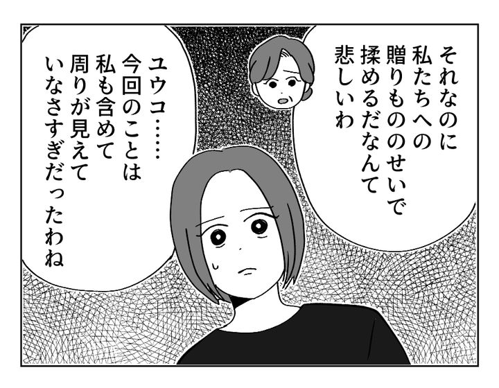 ユウコさんはお義母さんに言われたら、すんなりと言うことを聞くのですね(笑)。あんなにアキラさんには全力で反撃していたのに……。きっとそれくらいお義母さんがユウコさんにとって大きな存在なのでしょう。喜んで贈りものを受け取りつつも、実は見返りはいらなかったと言ったお義母さん。見返りがいらないなら、もっと早く贈りものを止めても……とは思いますが、それを受け取ってしまうところも人間らしいのかもしれません。ユウコさんが謝って一件落着ですね!