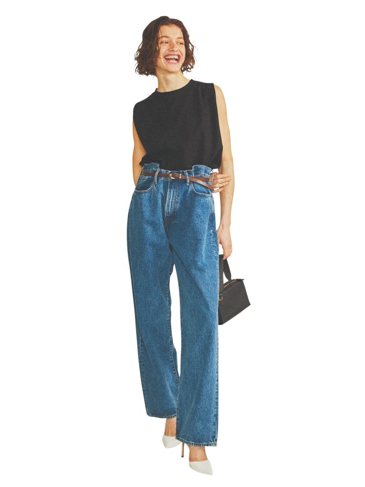 【POINT】ぶかっとしたボーイズデニムには、白よりも大人っぽく見える黒のノースリTが適任。INしたときもはりつかない身幅や、ベルトでしぼることによる動きのあるはき口で、デニムの気楽なムードも残せる。