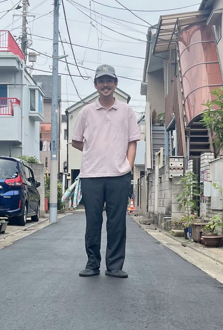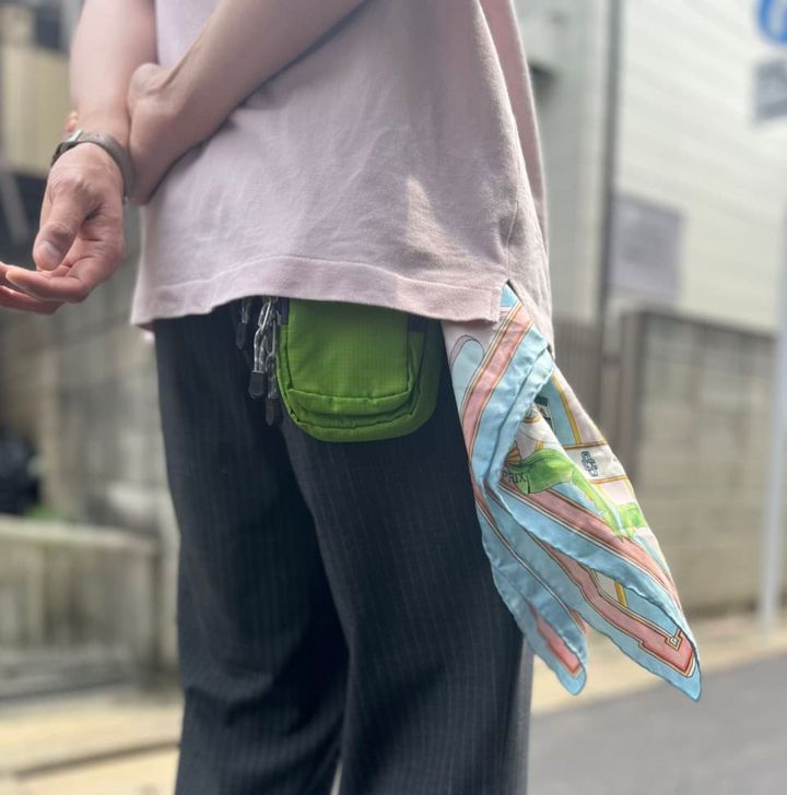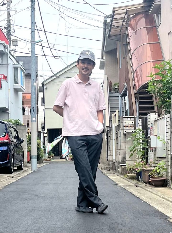 スポーツとクラシックをミックスしたスタイリングも目をひきます。「夏は着こなしが軽くなるので、ストライプのスラックスで重厚感を持たせました。とはいえ、やっぱり軽さも欲しいので、ポロシャツは淡いピンク、さらにはツヤ感のあるシルクスカーフで軽さも意識しています。そしてこだわりはウエストポーチ。最近はファッションで遊びたいと思っていたので、こういったハズしアイテムを取り入れるのがマイブームなんですよね。そもそも服を装うって楽しいことなので、いかに梅雨を楽しく乗り越えるか考えた結果、こういった着こなしになりました! 」