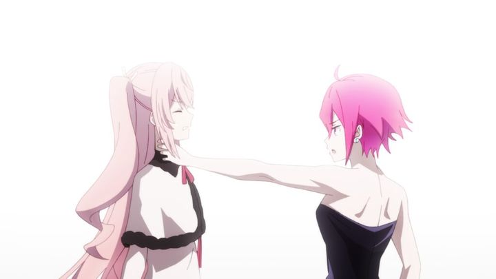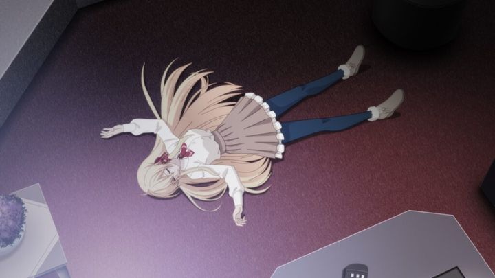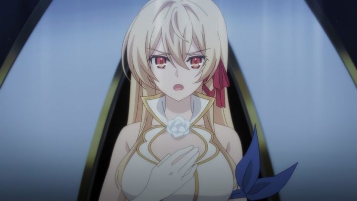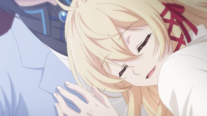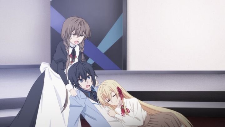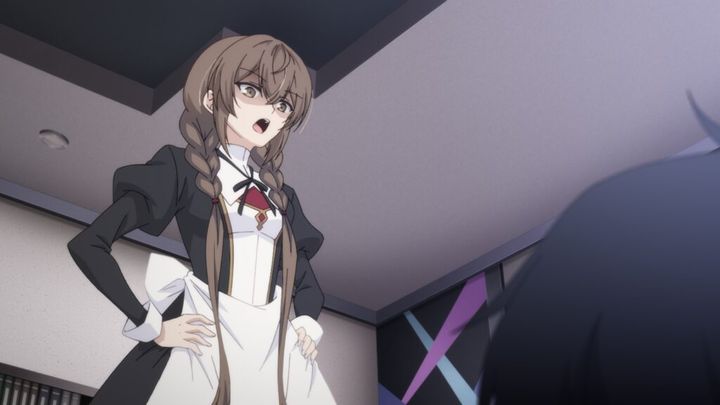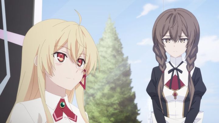 「まずい、すごくまずい気がする」と、イスカが赤面しながらアリスを起こそうとすると、そこに彼女の側近兼メイドである燐・ヴィスポーズ(CV:花守ゆみり)が登場! 床の上でアリスと抱き合っているように見えるイスカに、「帝国剣士、お前……!」と燐は殺意に満ちた目を向けた。