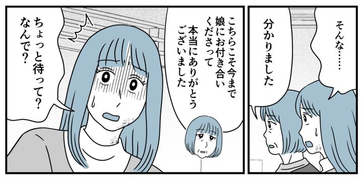 「そんな……」羽田さんが呆然とするなか、羽田さんのお母さんが「分かりました」と返してくれる。お父さんも「こちらこそありがとうございました」と話を終わらせようとする。そんな俺とご両親のやりとりに、羽田さんは青ざめていた。